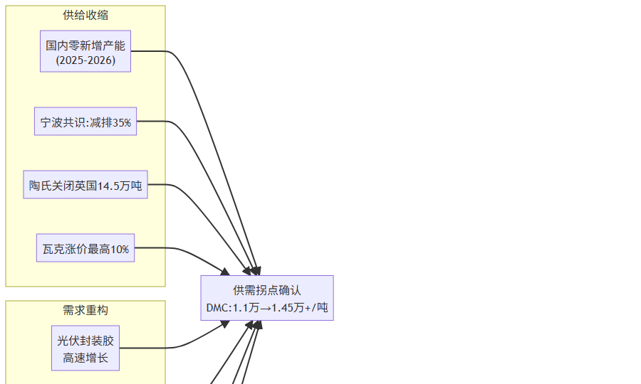 行业协同减产的脆弱性是最大的尾部风险。当前的"反内卷"协同本质上是一种寡头默契,而非法律约束。一旦DMC价格上涨到一定程度,个别企业有动力偷偷增产抢份额,协同就会破裂。历史上,化工行业的限产保价协议多次出现"囚徒困境"式的崩溃——2025年四季度之前,行业就是典型的"以量换价"格局,谁先减产谁吃亏。当前的协同能维持多久,取决于龙头企业的定力和惩罚机制的有效性。我个人判断,短期内(2026年上半年)协同破裂的概率较低,因为全行业刚从亏损中走出来,挺价意愿强烈;但中期(2026年下半年至2027年)需要密切关注。